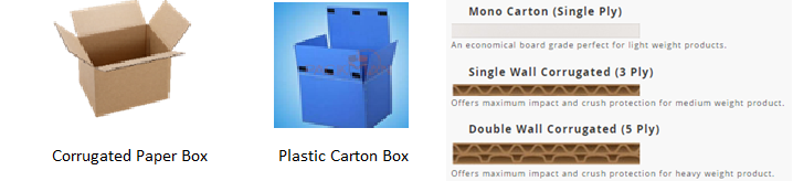 -Select 1 Ply Plastic Carton Box, 1 Ply Corrugated Paper Box, 2 Ply Plastic Carton Box,2 Ply Corrugated Paper Box, 3 Ply Plastic Carton Box, 3 Ply Corrugated Paper Box, 5 Ply Plastic Carton Box, 5 Ply Corrugated Paper Box.